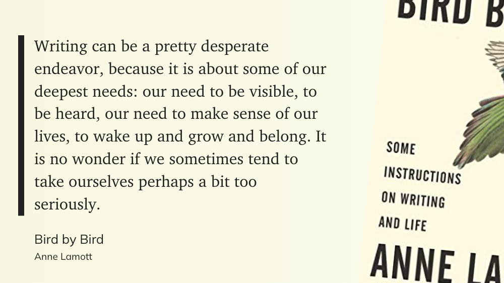 Fortunately, though, a small book slipped through the cracks of my obtuse parallel reading: Bird by Bird by Anne Lamotte, originally published in 1994. It is small enough that it took me just 4 days of dedicated attention to complete it. And I have to say, it was worth it.