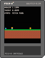 Next, we initialize the draw function. This is just basic Pico8 stuff. Don’t worry. It is not required to understand the AI. We are just rendering the three sprites for the hamburger, water, and player, plus writing the value of the hunger and thirst utility trackers.