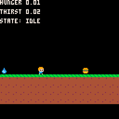 The updatestate function is elementary. We increase the player’s hunger and thirst at every frame by a small value. Then, we check if the player is near the burger or the water, and we zero the corresponding bodily sensation (if I eat a burger, I have zero hunger; if I drink water, I have zero thirsts).